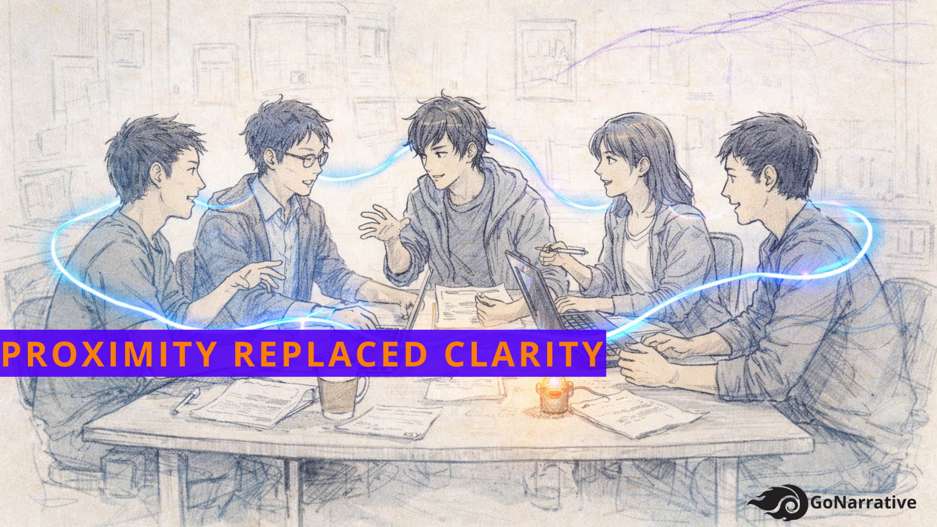 It is not a communication failure. It’s a structural one. The story that created early success — the scrappy founding pitch, the tight team who sat in one room — was never built to survive scale. It worked at 10 people because proximity substituted for clarity. Decisions traveled by hallway. Alignment was implicit.